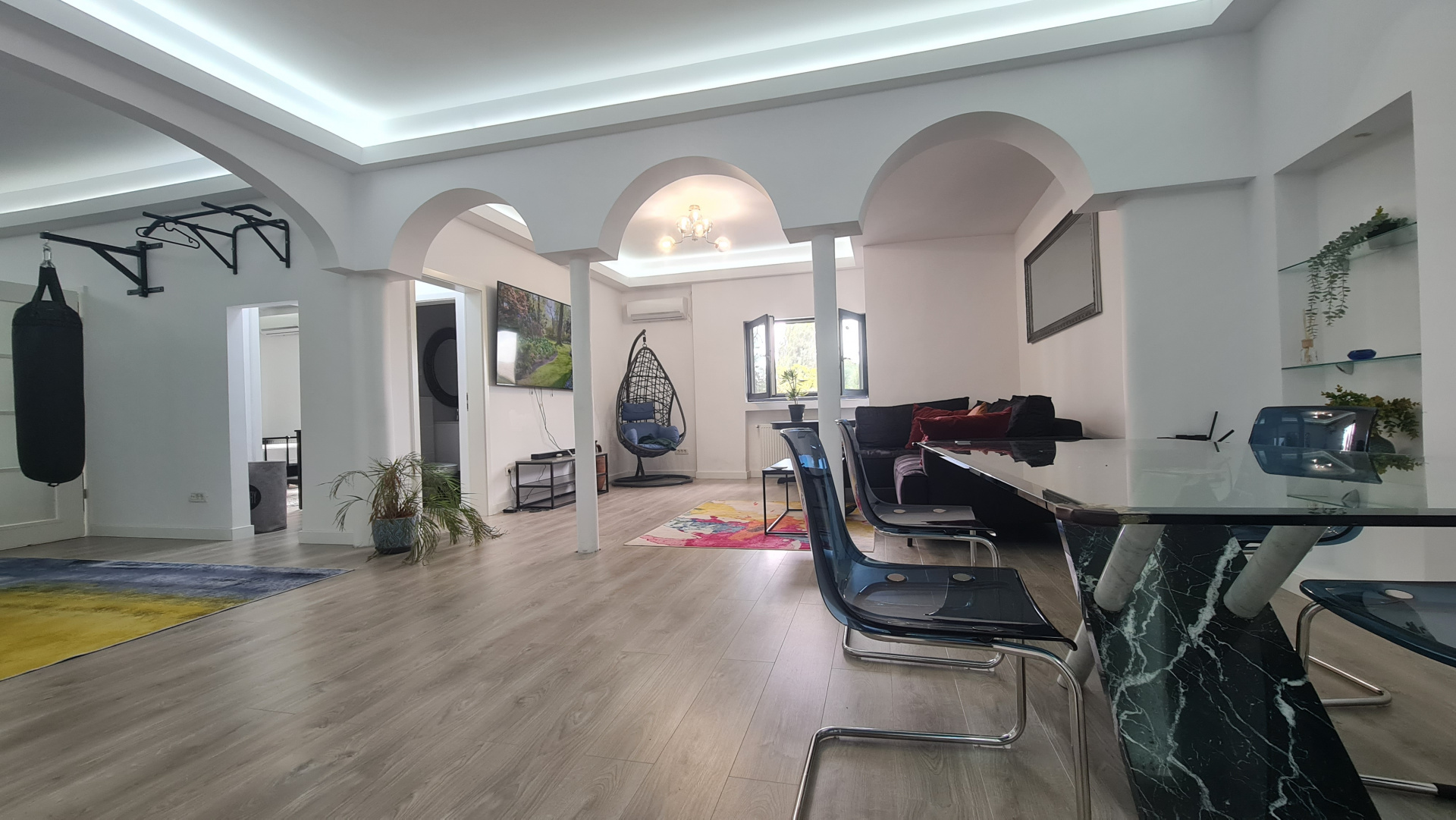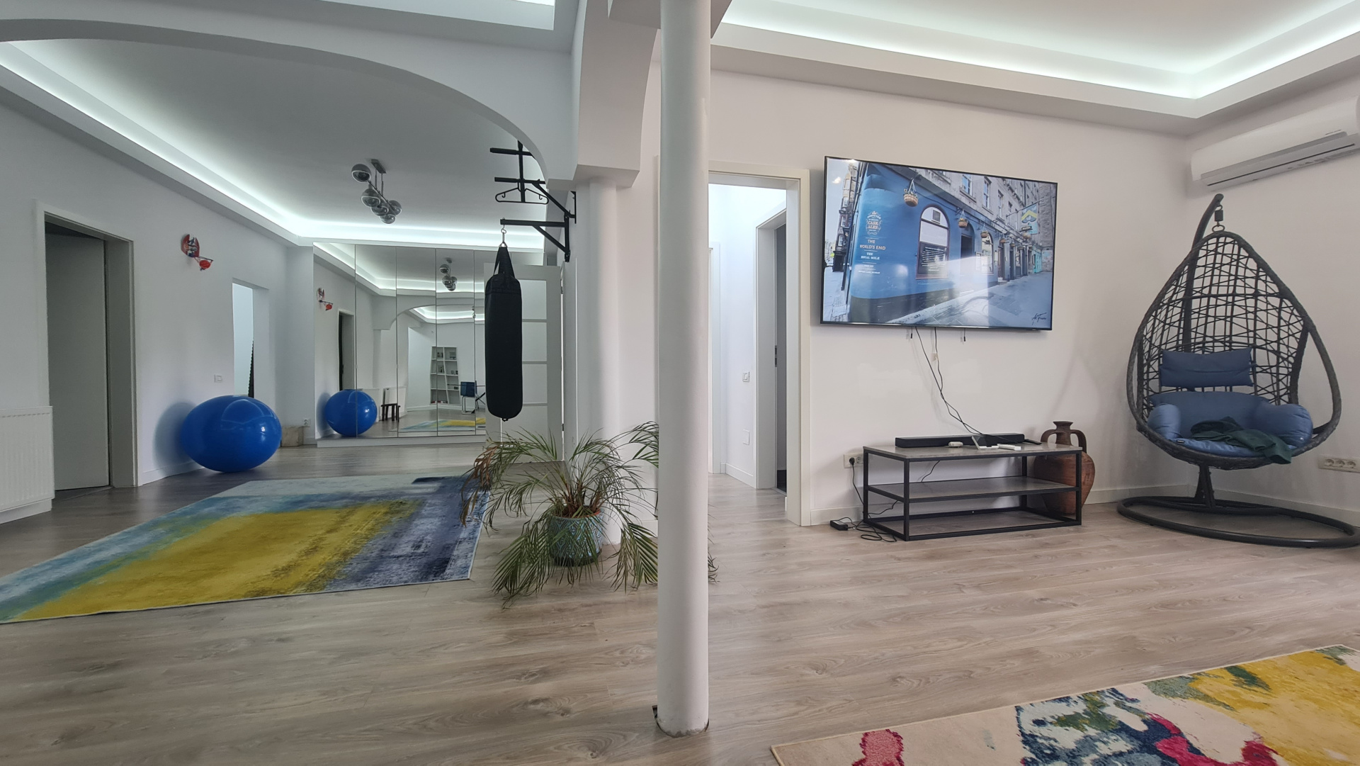 •Dotări: televizor mare potrivit pentru prezentări, training-uri sau afișare de portofoliu; conexiuni și prize ușor de adaptat pentru echipamente foto/video sau setup de birou.